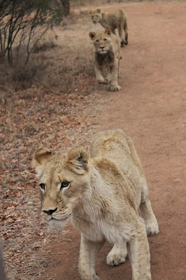 As one male from a pride would roar all the other females would join in together, and as a group they would run to the fence between the lion prides and get even louder. The second pride would follow in the same suits and you would hear this extremely loud roaring of about 14 lions. (too bad our video won't upload to this blog, otherwise you could enjoy it as well.) The prides could not see each other as the fence had a barrier in between them but the lions definitely knew who was on the other side. It was interesting as the lions were technically all family but their individual pride trumped any familial relations previously established. In the 2nd and oldest pride of lions, one of the females had given birth a few weeks ago and had 2 baby cubs with her that she was cleaning. The guide said that after 3 weeks with the mother they will go in and take the babies to raise them with the other cubs. It was hard not to feel bad for this poor lion to have her cubs taken from her but the guide said if they did not take the cubs they would likely be eaten by another lion in the pride.